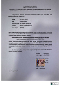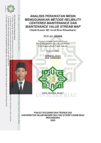 AFRIZAL ALGA, - (2025) ANALISIS PERAWATAN MESIN MENGGUNAKAN METODE RELIBILITY CENTERED MAINTENANCE DAN MAINTENANCE VALUE STREAM MAP (Studi Kasus: RS Awal Bros Pekanbaru). Skripsi thesis, Universitas Islam Negeri Sultan Syarif Kasim Riau.