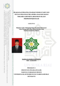 ABSTRAK Darma Ramadhani Ritonga, (2025) : Pelaksanaan Peraturan Daerah Nomor 03 Thun 2019 Tentang Perangkat Desa Di Desa Rasau Kecamatan Torgamba Kabupaten Labuhanbatu Selatan Perspektif Fiqih Siyasah Penelitian ini dilatarbelakangi oleh adanya dugaan penyimpangan prosedur dalam pemberhentian salah satu perangkat desa yang menimbulkan ketidakjelasan hukum serta ketidakadilan bagi pihak yang diberhentikan. Hal ini mendorong pentingnya peninjauan terhadap pelaksanaan peraturan daerah Nomor 03 Tahun 2019 tentang Perangkat Desa. Adapun yang menjadi permasalahan dalam penelitian ini adalah: 1. Bagaimana pelaksanaan Peraturan Daerah Nomor 03 Tahun 2019 Tentang Perangkat Desa di Desa Rasau Kecamatan Torgamba Kabupaten Labuhanbatu Selatan, 2. Apa faktor-faktor yang mempengaruhi Pelaksanaan Pemberhentian Perangkat Desa tersebut 3. Bagaimana perspektif fiqih siyasah terhadap pelaksanaan pemberhentian perangkat desa tersebut. Penelitian ini menggunakan metode penelitian deskriptif dengan menggunakan pendekatan analisis deskriptif kualitatif. Lokasi penelitian ini di desa Rasau kecamatan Torgamba kabupaten Labuhanbatu Selatan. Sumber data yang di gunakan adalah data primer berupa hasil observasi dan wawancara di lapangan yakni 1 orang Kepala Desa, 1 orang Sekretaris Desa, 3 orang Perangkat Desa, dan 2 orang masyarakat. Data sekunder berupa jurnal hukum, artikel hukum yang masih berkaitan dengan tema, informan dalam penelitian ini berjumlah tujuh informan, selanjutnya data diolah dan dianalisis secara deskriptif kualitatif, sehingga menghasilkan penelitian ilmiah yang dapat di pertanggung jawabkan. Hasil penelitian menunjukkan bahwa proses pemberhentian perangkat desa di Desa Rasau tidak sepenuhnya mengikuti ketentuan yang diatur dalam Peraturan Daerah Nomor 03 Tahun 2019, khususnya terkait asas transparansi, musyawarah, dan tahapan administratif. Adapun faktor-faktor yang mempengaruhi terhadap pelaksanaan perangkat desa di Desa Rasau kecamatan Torgamba kabupaten Labuhanbatu Selatan adalah: 1. Kurangnya pemahaman dan kepatuhan kepala desa terhadap prosedur hukum yang berlaku; 2. Lemahnya pengawasan dari pihak kecamatan maupun kabupaten terhadap pelaksanaan regulasi desa; 3. Adanya kecenderungan tindakan otoriter dari kepala desa atau Pj Kepala Desa dalam mengambil keputusan secara sepihak tanpa musyawarah dan akuntabilitas. Dalam perspektif Fiqih Siyasah, tindakan tersebut bertentangan dengan prinsip keadilan (‘adl), musyawarah (syura), dan amanah yang merupakan nilai dasar dalam kepemimpinan Islam. Kepala desa sebagai pemimpin memiliki tanggung jawab moral dan hukum untuk menjalankan kebijakan secara adil, terbuka, dan berdasarkan pertimbangan maslahat umat. Kata kunci : Pelaksanaan, Pemberhentian, Perangkat Desa, Perspektif, Fiqih Siyasah