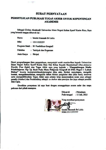 ISNAINI HASANAH BR LUBIS (2025) PENGEMBANGAN MEDIA PEMBELAJARAN POP UP BOOK PADA MATA PELAJARAN GEOGRAFI DI SMA NEGERI 1 LUBUK DALAM. Skripsi thesis, UNIVERSITAS ISLAM NEGERI SULTAN SYARIF KASIM RIAU.