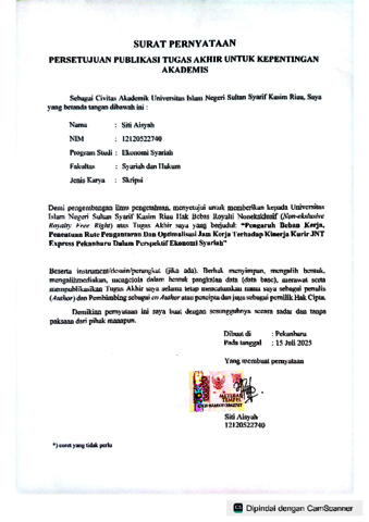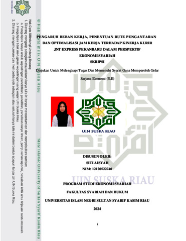 SITI AISYAH, - (2025) PENGARUH BEBAN KERJA, PENENTUAN RUTE PENGANTARAN DAN OPTIMALISASI JAM KERJA TERHADAP KINERJA KURIR JNT EXPRESS PEKANBARU DALAM PERSPEKTIF EKONOMI SYARIAH. Skripsi thesis, Universitas Islam Negeri Sultan Syarif Kasim Riau.