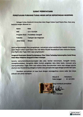 NIDA, - (2025) PENGARUH PENERAPAN MODEL PEMBELAJARAN TIME TOKEN TERHADAP KETERAMPILAN SOSIAL PADA MATA PELAJARAN GEOGRAFI DI MAN 4 KAMPAR. Skripsi thesis, UNIVERSITAS ISLAM NEGERI SULTAN SYARIF KASIM RIAU.