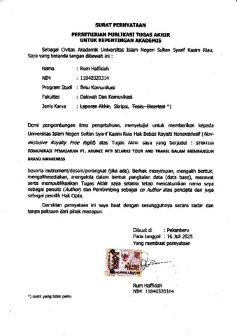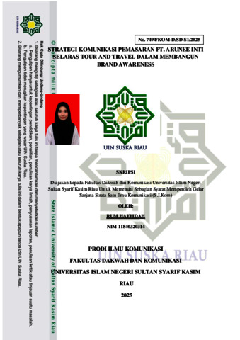 RUM HAFFIDAH, - (2025) STRATEGI KOMUNIKASI PEMASARAN PT. ARUNEE INTI SELARAS TOUR AND TRAVEL DALAM MEMBANGUN BRAND AWARENESS. Skripsi thesis, UNIVERSITAS ISLAM NEGERI SULTAN SYARIF KASIM RIAU.