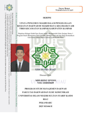 MHD RIZKY EFENDI, - (2025) UPAYA PENGURUS MASJID DALAM PENGELOLAAN KEGIATAN DAKWAH DI MASJID RAYA KELURAHAN AIR TIRIS KECAMATAN KAMPAR KABUPATEN KAMPAR. Skripsi thesis, UNIVERSITAS ISLAM NEGERI SULTAN SYARIF KASIM RIAU.