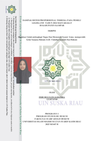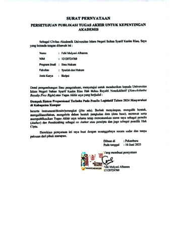 "ABSTRAK Febi Mulyani Alhamra (2025) : IMPLIKASI SISTEM PROPORSIONAL TERBUKA PADA PEMILU LEGISLATIF TAHUN 2024 DI KABUPATEN KAMPAR Pemilu Legislatif 2024 di Indonesia menerapkan sistem proporsional terbuka yang memberikan kesempatan kepada pemilih untuk secara langsung memilih calon legislatif, bukan hanya partai politik. Penerapan sistem ini di Kabupaten Kampar menimbulkan dinamika yang kompleks, termasuk meningkatnya persaingan internal partai, potensi politik uang, dan tantangan pengawasan pemilu. Dalam kontek ini pentingnya menganalisis lebih jauh dampak dari sistem proporsional terbuka Penelitian ini bertujuan untuk mengetahui implikasi sistem proporsional terbuka pada pemilu legislatif tahun 2024 di Kabupaten Kampar,dan untuk mengetahui faktor yang mempengaruhi terhadap Implikasi penerapan sistem proporsional terbuka pada lembaga legislatif tahun 2024 di Kabupaten Kampar. Penelitian ini menggunakan pendekatan empiris dengan metode kualitatif. Data diperoleh melalui wawancara mendalam dengan Komisi Pemilihan Umum (KPU) Kabupaten Kampar, Badan Pengawas Pemilu, serta penyebaran angket kepada masyarakat dilakukan studi kepustakaan guna memperkuat landasan teori dan kerangka hukum yang relevan dengan sistem proporsional terbuka. Pendekatan ini memungkinkan peneliti untuk melihat realitas di lapangan secara langsung dan mengaitkannya dengan regulasi yang berlaku. Penelitian menunjukkan bahwa sistem proporsional terbuka memberikan ruang lebih luas bagi masyarakat untuk berpartisipasi dalam proses politik, khususnya dalam memilih wakil rakyat yang dianggap paling mewakili aspirasi mereka. Namun, sistem ini juga menimbulkan persoalan serius seperti praktik politik uang, persaingan tidak sehat antarcalon, serta penyalahgunaan fasilitas dan kekuasaan. Fenomena ini mengancam prinsip keadilan dan kualitas demokrasi yang substantif. Oleh karena itu, dibutuhkan pengawasan pemilu yang lebih efektif, pendidikan politik yang masif, serta sinergi antara penyelenggara pemilu, pemerintah daerah, masyarakat sipil, dan media agar sistem proporsional terbuka benar-benar mampu menghasilkan pemilu yang bersih, jujur, dan adil. Kata kunci : Dampak, Proporsional Terbuka, Kabupaten Kampar"