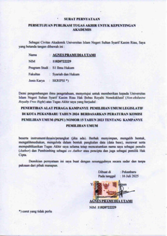AGNES PRAMUDIA UTAMI, - (2025) PENERTIBAN ALAT PERAGA KAMPANYE PEMILIHAN UMUM LEGISLATIF DI KOTA PEKANBARU TAHUN 2024 BERDASARKAN PERATURAN KOMISI PEMILIHAN UMUM (PKPU) NOMOR 15 TAHUN 2023 TENTANG KAMPANYE PEMILIHAN UMUM. Skripsi thesis, UNIVERSITAS ISLAM NEGERI SULTAN SYARIF KASIM RIAU.
