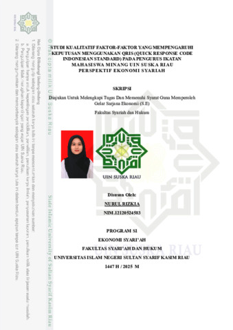 ABSTRAK Nurul Rizkia (2025) : Studi Kualitatif Faktor-Faktor Yang Mempengaruhi Keputusan Menggunakan QRIS (Quick Response Code Indonesian Standard) Pada Pengurus Ikatan Mahasiswa Minang UIN Suska Riau Perspektif Ekonomi Syariah Perkembangan teknologi digital telah mendorong masyarakat untuk beralih ke sistem pembayaran non-tunai, salah satunya melalui Quick Response Code Indonesian Standard (QRIS). QRIS menjadi solusi pembayaran yang cepat, aman, dan efisien. Pada mahasiswa, penggunaan QRIS pun mulai berkembang, termasuk di lingkungan Ikatan Mahasiswa Minang (IMAMIKA) UIN Suska Riau. Namun, tidak semua pengurus memiliki sikap yang sama dalam mengadopsinya. Sebagian aktif menggunakan QRIS, sementara sebagian lainnya masih ragu. Penelitian ini bertujuan untuk mengkaji faktor-faktor yang memengaruhi keputusan penggunaan QRIS Pada pengurus IMAMIKA, serta meninjau penggunaannya dari perspektif ekonomi syariah. Penelitian ini menggunakan pendekatan kualitatif dengan jenis studi kasus. Data dikumpulkan melalui wawancara mendalam, observasi, dan dokumentasi terhadap lima informan yang dipilih secara purposive. Teknik analisis data mengacu pada model Miles dan Huberman, yang meliputi proses reduksi data, penyajian data, serta penarikan dan verifikasi kesimpulan. Berdasarkan hasil penelitian, ditemukan bahwa keputusan untuk menggunakan QRIS dipengaruhi oleh persepsi manfaat, persepsi kemudahan menggunakan, dan persepsi risiko. QRIS dipandang memberikan kemudahan dalam transaksi, mendukung efisiensi organisasi, dan meningkatkan transparansi keuangan. Meski terdapat kekhawatiran terhadap risiko teknis, hal tersebut tidak menjadi hambatan utama. Dalam perspektif ekonomi syariah, menggunakan QRIS dinilai sesuai karena menghindari unsur-unsur yang dilarang dalam Islam dan mencerminkan prinsip keadilan, kejelasan akad, serta kemaslahatan. Kata Kunci: Studi Kualitatif, Keputusan Menggunakan, QRIS, Ekonomi Syariah