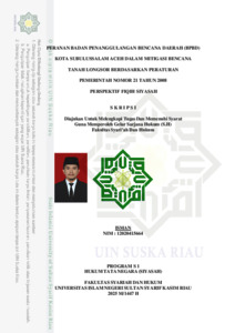 ABSTRAK Isman (2025): “Peranan Badan Penanggulangan Bencana Daerah (BPBD) Kota Subulussalam Aceh Dalam Mitigasi Bencana Tanah Longsor Berdasarkan Peraturan Pemerintah Nomor 21 Tahun 2008 Perspektif Fiqih Siyasah” Penelitian ini dilatar belakangi oleh terbitnya Peraturan pemerintah Nomor 21 Tahun 2008 Tentang Penyelenggaraan Penanggulangan Bencana, didalamnya membahas peran dari Badan Penanggulangan Bencana Daerah mengenai mitigasi bencana alam. Dalam menjalankan perannya, BPBD masih mengalami kendala-kendala di lapangan. Adapun yang menjadi Permasalahan pada penelitian ini adalah sebagai berikut: 1. Bagaimana peranan BPBD Kota Subulussalam dalam mitigasi bencana tanah longsor berdasarkan Peraturan pemerintah Nomor 21 Tahun 2008. 2. Apa faktor-faktor yang mempengaruhinya, 3. Bagaimana perspektif fiqh siyasah terhadap peran BPBD Kota Subulussalam menanggulangi bencana. Metode penelitian ini meliputi dari jenis penelitian (Field research) dengan menggunakan pengumpulan data melalui mekanisme observasi, wawancara serta dokumentasi. Informan yang digunakan dalam penelitian ini terdiri dari 5 informan yang terdiri dari 3 penjabat Badan Penanggulangan Bencana Daerah Kota Subulussalam serta 2 orang masyarakat seluruhnya menjadi infoman penelitian dengan menggunakan total sampling, analisis data yang digunakan .dalam penelitian ini menggunakan Analisis Deskriftif Kualitatif. Hasil penelitian menunjukkan bahwa Badan Penanggulangan Bencana Daerah sudah berperan dalam melakukan mitigasi bencana tanah longsor sebagaimana yang telah diamanatkan oleh Peraturan pemerintah Nomor 21 Tahun 2008, namun belum maksimal. Peran yang telah dilakukan mulai dari melakukan perencanaan dan perancangan, pembangunan infrstruktur, pelatihan, serta melakukan sosialisai kepada masyarakat. Pembangunan infrastruktur yang dilakukan adalah melakukan pembangunan pondasi ditempat yang rawan terjadi tanah longsor, serta sosialisasi kepada masyarakat mengenai dampak bencana dan juga menjaga lingkungan agar terhindar dari bencana alam tanah longsor. Perspektif Fiqih Siyasah terhadap peranan dari Badan Penanggulangan Bencana Daerah Kota Subulussalam, sejalan dengan pemahaman yang berkaitan tentang siyasah dusturiyah dimana dalam menjalankan perannya harus dilandasi dari peraturan pemerintah serta Badan Penanggulangan Bencana Daerah bertanggung jawab kepada masyarakat dalam melakukan mitigasi bencana alam agar masyarakat terlindungi dari bencana alam. Kata Kunci: Peranan, Badan Penanggulangan Bencana Daerah, Mitigasi, Bencana Tanah, Fiqih Siyasah