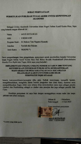 AGUS SETIAWAN, - (2025) IMPLEMENTASI UNDANG-UNDANG NOMOR 14 TAHUN 2008 TENTANG KETERBUKAAN INFORMASI PUBLIK GUNA KESEJAHTERAAN MASYARAKAT DI DESA SAKA PALAS JAYA KECAMATAN PELANGIRAN KABUPATEN INDRAGIRI HILIR PERSPEKTIF FIQIH SIYASAH. Skripsi thesis, UNIVERSITAS ISLAM NEGERI SULTAN SYARIF KASIM RIAU.
