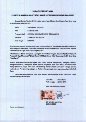 ABSTRAK Eri Nanda Saputra (2025): “Pelaksanaan Sewa Menyewa Lapangan iv Badminton Dengan Sistem Member Menurut Perspektif Fiqh Muamalah (Studi Kasus GOR Badminton BCAF Kecamatan Bukit Raya Kota Pekanbaru)” Penulisan skripsi ini dilatarbelakangi oleh penerapan sewa menyewa lapangan badminton dengan sistem member di GOR badminton BCAF Kecamatan Bukit Raya Kota Pekanbaru. Dalam praktiknya apabila pihak penyewa lapangan yang sudah membayar biaya sewa di awal akad tidak hadir diwaktu yang telah ditentukan, maka biaya sewa dianggap hangus. Padahal jika dilihat dari penyebab ketidakhadirannya semata bukan karena keinginan para penyewa melainkan faktor lain yang mengharuskan mereka tidak bisa hadir. Permasalahan dalam skripsi ini adalah bagaimana pelaksanaan sewa menyewa lapangan badminton dengan sistem member dan bagaimana perspektif Fiqh Muamalah terhadap pelaksanaan sewa menyewa lapangan badminton dengan sistem Member. Tujuan penelitian ini adalah untuk mengetahui pelaksanaan sewa menyewa lapangan badminton dengan sistem member dan untuk menjelaskan perspektif fiqh muamalah terhadap pelaksanaan sewa menyewa lapangan badminton dengan sistem member. Dalam penelitian ini metode yang dipakai adalah metode kualitatif (field research). Populasi dalam penelitian ini berjumlah 40 orang penyewa serta 1 pemilik dan 1 penjaga dan sampel dalam penelitian ini berjumlah 10 penyewa serta 1 pemilik dan 1 penjaga. Sumber data primer dalam penelitian ini diperoleh melalui observasi dan wawancara, sedangkan data sekunder diperoleh dari berbagai literatur kepustakaan. Teknik pengumpulan data dalam penelitian ini dengan cara observasi, wawancara dan dokumentasi. Teknik analisis data dalam penelitian ini bersifat analisis deskriptif. Hasil penelitian menunjukkan bahwa dalam transaksi sewa menyewa lapangan badminton dengan sistem member adalah dimana para penyewa membayar lunas biaya sewa di awal akad untuk memakai fasilitas lapangan selama satu bulan dengan jadwal yang ditentukan. Terdapat kerugian dan keuntungan dalam transaksi ini. Dimana kerugiannya adalah apabila para penyewa tidak hadir pada waktu yang ditentukan, maka biaya sewa yang telah dibayar saat awal akad akan hangus padahal ketidakhadiran disebabkan faktor lain. Sehingga sering terjadi kesalahpahaman antara penyewa dan pemilik sewa disebabkan kurang jelasnya akad di awal. Sedangkan keuntungannya sangat banyak baik bagi penyewa maupun pemilik sewa karean tujuan dasar sistem member ini adalah saling menguntungkan. Tinjauan Fiqh Muamalah terhadap pelaksanaan sewa menyewa lapangan badminton dengan sistem member melihat prinsip dan asas sewa menyewa serta prinsip dasar muamalah selama sewa menyewa tidak bertentangan dengan prinsip dan asas tersebut maka sewa menyewa sistem member hukumnya boleh. Kata Kunci: Sewa Menyewa, GOR BCAF, Badminton, Member.