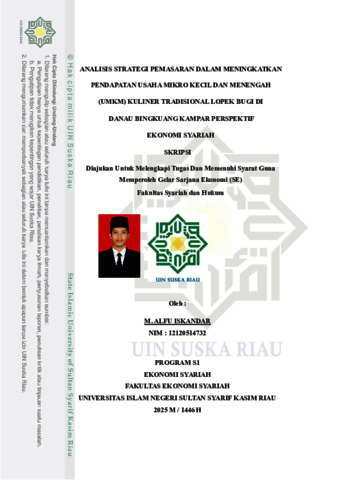 M. ALFU ISKANDAR, - (2025) ANALISIS STRATEGI PEMASARAN DALAM MENINGKATKAN PENDAPATAN USAHA MIKRO KECIL DAN MENENGAH (UMKM) KULINER TRADISIONAL LOPEK BUGI DI DANAU BINGKUANG KAMPAR PERSPEKTIF EKONOMI SYARIAH. Skripsi thesis, UNIVERSITAS ISLAM NEGERI SULTAN SYARIF KASIM RIAU.