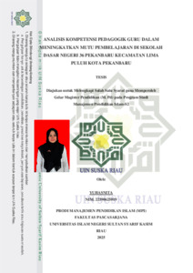 ABSTRAK Yuhasnita (2025) : Analisis Kompetensi Pedagogik Guru Dalam Meningkatkan Mutu Pembelajaran Di Sekolah Dasar Negeri 36 Pekanbaru Kecamatan Limapuluh Kota Pekanbaru. Kompetensi guru adalah salah satu faktor yang mempengaruhi tercapainya tujuan pembelajaran dan pendidikan di sekolah, namun kompetensi guru tidak berdiri sendiri, tetapi dipengaruhi latar belakang pendidikan, pengalaman mengajar, dan lamanya mengajar. Berangkat dari paradigma tersebut, penelitian ini bertujuan untuk mengetahui kompetensi pedagogik guru untuk meningkat meningkatkan kualitas pendidikan di Sekolah Dasar Negeri 36 Pekanbaru Kecamatan Lima Puluh Pekanbaru. Penelitian ini menggunakan pendekatan kualitatif dengan metode wawancara mendalam dan dokumentasi. Pemeriksaan keabsahan data dilakukan dengan memperpanjang waktu penelitian dan triangulasi. Hasil penelitian menunjukkan bahwa: (1) pedagogik guru merupakan salah satu faktor yang sangat penting dalam meningkatkan mutu pendidikan (2) Mutu pembelajaran Pendidikan di Sekolah Dasar Negeri 36 Pekanbaru Kecamatan Lima Puluh Pekanbaru diwujudkan dengan penerapan pembelajaran aktif, kreatif, dan menyenangkan serta melalui penelitian tindakan kelas. (3) Upaya Kepala Sekolah dalam meningkatkan kompetensi pedagogik guru di Sekolah Dasar Negeri 36 Pekanbaru Kecamatan Lima Puluh Pekanbaru adalah dengan meningkatkan kompetensi guru melalui kursus dan diklat, pengadaan sumber dan media Pembelajaran, mengelola lingkungan belajar, penerapan e-learning, dan controling (4) Upaya guru Sekolah Dasar Negeri 36 Pekanbaru Kecamatan Lima Puluh Pekanbaru dalam meningkatkan pedagogiknya dengan mengikuti diklat dan Kelompok Kerja Guru, dan membuat penelitian tindakan kelas. Kata kunci: kompetensi pedagogik, mutu pembelajaran, guru sekolah dasar, pendidikan dasar, penelitian kualitatif