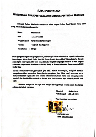 KHOIRIANSAH (2025) ENGLISH LANGUAGE MINDSET OF NON ENGLISH EDUCATION DEPARTMENT STUDENTS : A SURVEY STUDY AT ARABIC EDUCTION DEPARTMENT OF UIN SUSKA RIAU. Skripsi thesis, UNIVERSITAS ISLAM NEGERI SULTAN SYARIF KASIM RIAU.