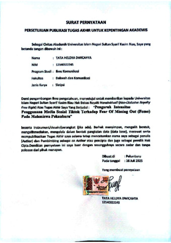 TATA HELDYA DWICAHYA, - (2025) PENGARUH INTENSITAS PENGGUNAAN MEDIA SOSIAL TIKTOK TERHADAP FEAR OF MISSING OUT (FoMO) PADA MAHASISWA PEKANBARU. Skripsi thesis, UNIVERSITAS ISLAM NEGERI SULTAN SYARIF KASIM RIAU.