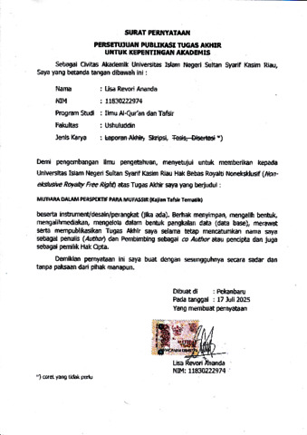 SURAT PERNYATAAN-1 - LISA REVORI ANANDA ILMU ALQURAN DAN TAFSIR.pdf - Published Version Download (610kB) | Preview |