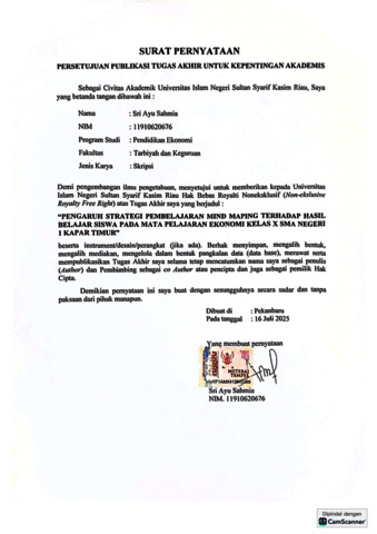 ABSTRAK Sri Ayu Sahmia (2025) : Pengaruh Strategi Pembelajaran Mind Mapping Terhadap Hasil Belajar Siswa Pada Mata Pelajaran Ekonomi Kelas X SMA NEGERI 1 KAMPAR TIMUR Tujuan dari penelitian adalah untuk mengetahui pengaruh strategi pembelajaran mind mapping terhadap hasil belajar siswa pada mata Pelajaran ekonomi kelas X SMA NEGERI 1 KAMPAR TIMUR. Penelitian ini menggunakan metode Quasi Eksperimen. Populasi didalam penelitian ini adalah seluruh siswa kelas X SMAN 1 KAMPAR TIMUR dengan keseluruhan 234 peserta didik. Sampel penelitian adalah siswa kelas X IPS 5 untuk kelas eksperimen dengan perlakuan menggunakan strategi pembelajaran mind mapping dan X IPS 6 untuk kelas kontrol dengan perlakuan menggunakan strategi pembelajaran konfensional. Teknik pengumpulan data dilakukan dengan test soal dan dokumentasi. Analisis data penelitian ini menggunakan uji t-test. Berdasarkan hasil penelitian dapat disimpulkan bahwa berdasarkan hasil uji t dengan memperoleh Sig = 0,000, t hitung = 12.055, df = n – k = 46 – 2 = 44 pada taraf signifikan 5% = 1.680, Sehingga diperoleh t hitung > t tabel atau 12.055 > 1,680. Atau 0,000 < 0,05, dengan demikian Ho ditolak dan Ha diterima, berdasarkan penjelasan diatas dapat diketahui bahwa adanya pengaruh penggunaan strategi pembelajaran mind mapping terhadap hasil belajar siswa pada mata pelajran ekonomi kelas X SMA NEGERI 1 KAMPAR TIMUR Kata Kunci : Strategi Pembelajaran Mind Mapping, Hasil Belajar siswa