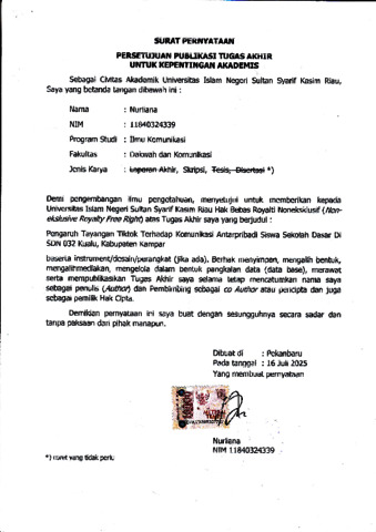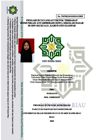 NURLIANA, - (2025) PENGARUH TAYANGAN TIKTOK TERHADAP KOMUNIKASI ANTARPRIBADI SISWA SEKOLAH DASAR DI SDN 032 KUALU, KABUPATEN KAMPAR. Skripsi thesis, UNIVERSITAS ISLAM NEGERI SULTAN SYARIF KASIM RIAU.