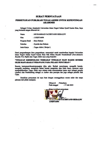 ABSTRAK MUHAMMAD : Tinjauan Kriminologi Terhadap Tindakan Main FACHRYAND Hakim Sendiri Oleh Masyarakat Perawang Pada HERALDY (2025) Pelaku Pencurian. Main hakim sendiri merupakan suatu hal yang terjadi karena kurangnya pengetahuan dan tingkat pendidikan karakter yang rendah. Tindakan main hakim sendiri merujuk pada situasi di mana seseorang mengambil hukum di tangannya sendiri tanpa melalui proses hukum yang sah. Padahal ada asas praduga tak bersalah, yaitu asas di mana seseorang dianggap tidak bersalah hingga pengadilan menyatakan bersalah. Adapun fenomena yang terjadi di Kota Perawang, Kecamatan Tualang, Kabupaten Siak, sering terjadi kasus pencurian kendaraan bermotor, begal hingga pembunuhan dan dari kasus tersebut ada beberapa pelaku yang tertangkap basah sehingga masyarakat melakukan tindakan kekerasan main hakim sendiri kepada pelaku yang dilakukan dalam bentuk pemukulan atau penganiayaan secara bersama-sama atau pengeroyokan terhadap pelaku yang melakukan tindak pidana tersebut. Adapun yang menjadi rumusan masalah dari penelitian ini adalah bagaimana pandangan masyarakat Perawang terhadap tindakan main hakim sendiri pada pelaku pencurian, serta apa aktor-faktor yang mempengaruhi masyarakat melakukan tindakan main hakim sendiri pada pelaku pencurian. Penelitian ini merupakan penelitian empiris/sosiologis, yaitu penelitian lapangan yang menggunakan metode pendekatan sosiologi hukum yakni melihat sesuatu kenyataan hukum di dalam masyarakat. Teknik pengambilan sampel dalam penelitian ini adalah purposive sampling. Sumber data dalam penelitian ini yaitu data primer dan data sekunder. Analisis yang digunakan adalah analisis kualitatif dan penarikan kesimpulan secara induktif. Adapun pandangan masyarakat Perawang terhadap tindakan main hakim sendiri pada pelaku pencurian terjadi disebabkan kemarahan masyarakat kepada pelaku tindak pidana karena mengambil tanpa hak barang-barang milik masyarakat, sehingga hal tersebut membuat masyarakat melakukan perbuatan main hakim sendiri. Penegakan hukum dan keadilan harus sejalan agar tidak berdampak kepada terjadinya perbuatan-perbuatan masyarakat yang dilakukan diluar koridor hukum. Kurangnya kepercayaan masyarakat terhadap penegakan hukum akan berdampak kepada terjadinya perbuatan-perbuatan main hakim sendiri yang dianggap sebagai suatu upaya untuk melawan ketidakadilan atau menerapkan suatu hukum dengan cara sendiri. Sedangkan faktor-faktor yang mempengaruhi masyarakat melakukan tindakan main hakim sendiri pada pelaku pencurian di Kota Perawang tepatnya di Kecamatan Tualang, Kabupaten Siak diantaranya adalah (i) faktor internal; dan (ii) faktor eksternal dari masyarakat itu sendiri. Kata Kunci : Kriminologi, Main Hakim, Masyarakat.