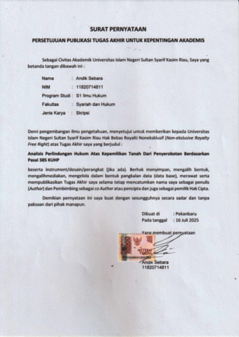 ANDIK SEBARA, - (2025) ANALISIS PERLINDUNGAN HUKUM ATAS KEPEMILIKAN TANAH DARI PENYEROBOTAN BERDASARKAN PASAL 385 KUHP. Skripsi thesis, UNIVERSITAS ISLAM NEGERI SULTAN SYARIF KASIM RIAU.