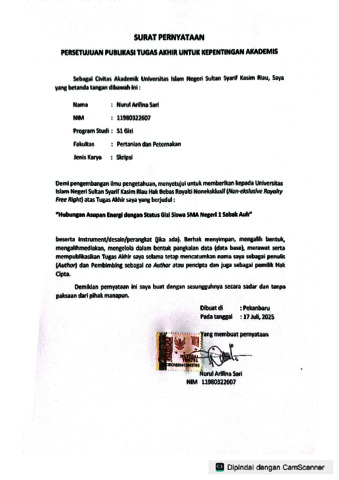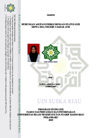 Nurul Arifina Sari, - (2025) HUBUNGAN ASUPAN ENERGI DENGAN STATUS GIZI SISWA SMA NEGERI 1 SABAK AUH. Skripsi thesis, UNIVERSITAS ISLAM NEGERI SULTAN SYARIF KASIM RIAU.
