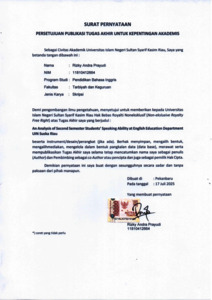 RIZKY ANDRA PRAYUDI (2025) AN ANALYSIS OF SECOND SEMESTER STUDAN ANALYSIS OF SECOND SEMESTER STUDENTS' SPEAKING ABILITY AT ENGLISH EDUCATION DEPARTMENT UIN SUSKA RIAUENTS SEPAKING ABILITY AT ENGLISH. Skripsi thesis, UNIVERSITAS ISLAM NEGERI SULTAN SYARIF KASIM RIAU.