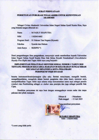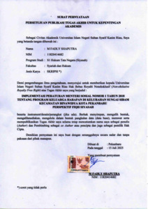 M FADLY SHAPUTRA, - (2025) IMPLEMENTASI PERATURAN MENTERI SOSIAL NOMOR 1 TAHUN 2018 TENTANG PROGRAM KELUARGA HARAPAN DI KELURAHAN SUNGAI SIBAM KECAMATAN BINAWIDYA KOTA PEKANBARU PERSPEKTIF FIQH SIYASAH. Skripsi thesis, UNIVERSITAS ISLAM NEGERI SULTAN SYARIF KASIM RIAU.