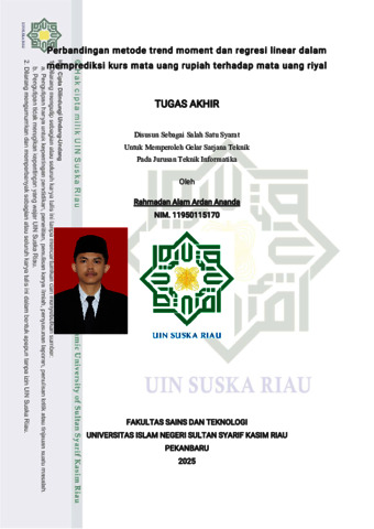 RAHMADAN ALAM ARDAN ANANDA, - (2025) Perbandingan metode trend moment dan regresi linear dalammemprediksi kurs mata uang rupiah terhadap mata uang riyal. Journal of Computer System and Informatics (JoSYC), 6 (3). pp. 562-571. ISSN ISSN 2714-7150 (media cetak) , ISSN 2714-8912 (media online)
