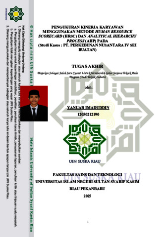 YANUAR IMADUDDIN, - (2025) PENGUKURAN KINERJA KARYAWAN MENGGUNAKAN METODE HUMAN RESOURCE SCORECARD (HRSC) DAN ANALYTICAL HIERARCHY PROCESS (AHP) PADA (Studi Kasus : PT. PERKEBUNAN NUSANTARA IV SEI BUATAN). Skripsi thesis, UNIVERSITAS ISLAM NEGERI SULTAN SYARIF KASIM RIAU.