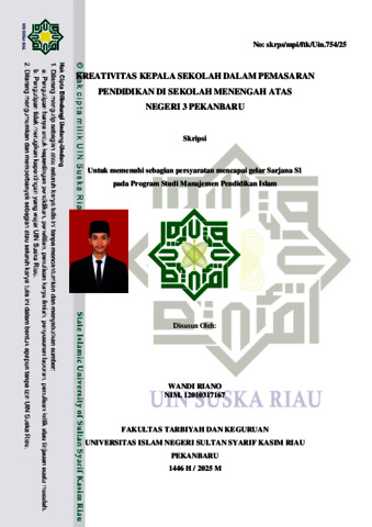 ABSTRAK Wandi Riano, (2025) : Kreativitas Kepala Sekolah Dalam Pemasaran Pendidikan Di Sekolah Menengah Atas Negeri 3 Pekanbaru Penelitian ini bertujuan untuk mengetahui, bentuk Kreativitas Kepala Sekolah dalam Pemasaran Pendidikan di Sekolah Menengah Atas Negeri 3 Pekanbaru. Metode yang dilakukan dalam penelitian ini adalah kualitatif dengan analisis deskriptif. Informan utamanya kepala sekolah, informan pendukung guru, orangtua wali murid, dan siswa. Teknik pengumpulan datanya yaitu, obaervasi, wawancara, dan dokumentasi. Hasil temuan penelitian adalah bentuk kreativitas kepala sekolah dalam pemasaran pendidikan di sekolah menengah atas negeri 3 pekanbaru bahwa, kreativitas kepala sekolah memegang peran strategis dalam meningkatkan daya tarik sekolah di tengah persaingan pendidikan. Kepala sekolah yang inovatif mampu menciptakan berbagai program unggulan, membangun citra positif sekolah, dan menjalin kerja sama dengan berbagai pihak sebagai bagian dari strategi pemasaran. Berbagai bentuk kreativitas yang ditunjukkan antara lain: a) penidaan penggunaan media makanan yang berkemasan plastik, b) tidak adanya tempat sampah diruangan sekolah, c) menjadikan lingkungan sehat, bersih, adiwiyata, d) pengembangan kurikulum yang adaptif, e) pemanfaatan media sosial sebagai sarana promosi, f) penyelenggaraan kegiatan yang melibatkan masyarakat. Kata Kunci: Kreativitas Kepala Sekolah, dan Pemasaran Pendidikan