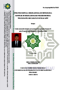 ABSTRAK Reza Ferdiansyah, (2025): Strategi Kepala Sekolah Dalam Mengelola Konflik Di Sekolah Dasar Negeri 004 Desa Teluk Batil Kecamatan Sungai Apit Strategi adalah suatu rencana atau pendekatan yang disusun secara sistematis dan terarah untuk mencapai tujuan tertentu. Penelitian ini bertujuan untuk menjelaskan konflik yang sedang terjadi, penyebab terjadinya konflik, bagaimana strategi kepala sekolah dalam mengelola konflik pada SDN 004 Desa Teluk Batil. Peneliti menggunakan jenis penelitian kualitatif sehingga menghasilkan data deskriptif yang terkait dengan fakta yang diamati di tempat kejadian. Proses pengumpulan data dilakukan dengan teknik wawancara. Teknik analisis data yang digunakan yaitu, reduksi data, penyajian data, dan penarikan kesimpulan. Peneliti menemukan konflik yang terjadi yaitu konflik antar siswa berupa bullying dan perkelahian, sedangkan konflik antara guru dan staff TU berupa keterlambatan staff TU terhadap pelayanan administrasi sekolah dan untuk konflik antara orang tua siswa dan pihak sekolah berkaitan dengan masalah penyaluran bantuan pendidikan seperti bantuan seragam sekolah. Kemudian, untuk penyebab terjadinya konflik antar siswa seperti kesalahpahaman dalam komunikasi dan perbedaan karakter, pengaruh negatif dari teman sebaya, sedangkan penyebab konflik antar guru dan staff TU di sebabkan oleh kurangnya komunikasi, perbedaan persepsi dan karakter individu. Penyebab terjadinya konflik dengan orang tua siswa karena ketidakadilan dan iri hati dalam penyaluran bantuan dan kurangnya komunikasi dan transparansi sekolah .Pada konflik antar siswa, kepala sekolah memfokuskan strateginya pada pendekatan edukatif dan pembinaan karakter, sedangkan konflik antar guru dan staff TU kepala sekolah menerapkan strategi pendekatan komunikatif dan mediasi konflik dengan orang tua siswa, kepala sekolah menerapkan strategi berbasis musyawarah, empati. Kata Kunci : Strategi, Konflik, Kepala Sekolah, Komunikasi Efektif, bullying