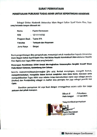 FACHRI DERMAWAN (2025) PENERAPAN PENDEKATAN STEM UNTUK MENINGKATKAN KETERAMPILAN BERPIKIR KREATIF SISWA PADA MATERI GETARAN, GELOMBANG DAN CAHAYA. Skripsi thesis, UNIVERSITAS ISLAM NEGERI SULTAN SYARIF KASIM RIAU.