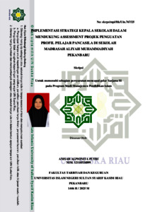ABSTRAK Anisah Alpionita Putri (2025) : Implementasi Strategi Kepala Sekolah Dalam Mendukung Assessment Projek Penguatan Profil Pelajar Pancasila Di Sekolah MA Muhammadiyah Pekanbaru Penelitian Perubahan kurikulum menjadi Kurikulum Merdeka membawa tantangan baru bagi satuan pendidikan, terutama dalam melaksanakan Projek Penguatan Profil Pelajar Pancasila (P5). Salah satu tantangan utamanya adalah dalam proses assessment yang belum optimal. Penelitian ini bertujuan untuk mengetahui strategi kepala sekolah dalam mendukung assessment Projek P5 serta mengidentifikasi faktor pendukung dan penghambat pelaksanaannya di MA Muhammadiyah Pekanbaru. Metode penelitian yang digunakan adalah kualitatif deskriptif, dengan teknik pengumpulan data melalui observasi, wawancara, dan dokumentasi. Hasil penelitian menunjukkan bahwa strategi yang digunakan kepala sekolah meliputi perencanaan, pelaksanaan, pengawasan, pengendalian, dan evaluasi. Strategi tersebut dilaksanakan melalui pembentukan tim fasilitator, penentuan tema, penyusunan perangkat ajar, serta evaluasi rutin terhadap proses dan hasil kegiatan. Faktor pendukung pelaksanaan assessment P5 mencakup adanya pelatihan guru, dukungan dari kepala sekolah, serta ketersediaan fasilitas pembelajaran. Sementara itu, faktor penghambat yang ditemukan meliputi kurangnya pemahaman guru terhadap dimensi dan indikator P5, keterbatasan sarana, dan minimnya dukungan orang tua terhadap kegiatan proyek siswa. Kesimpulan dari penelitian ini adalah bahwa strategi kepala sekolah sangat berperan dalam keberhasilan assessment Projek P5, meskipun masih terdapat berbagai kendala yang harus diatasi melalui penguatan sumber daya dan sinergi antara seluruh pemangku kepentingan di lingkungan sekolah. Kata kunci : Strategi Kepala Sekolah, Assessment, Profil Pelajar Pancasila, Kurikulum Merdeka, MA Muhammadiyah Pekanbaru.
