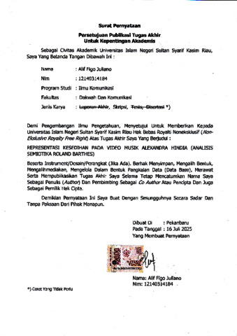 ALIF FIGO JULIANO, - (2025) REPRESENTASI KESEDIHAN PADA VIDEO MUSIK ALEXANDRA HINDIA (ANALISIS SEMIOTIKA ROLAND BARTHES). Skripsi thesis, UNIVERSITAS ISLAM NEGERI SULTAN SYARIF KASIM RIAU.