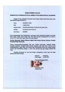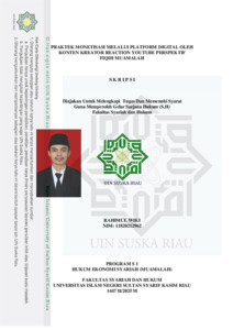 ABSTRAK Rahimul Wiki (2025) : Praktek Monetisasi Melalui Platform Digital Oleh Konten Kreator Reaction Youtube Perspektif Fiqih Muamalah Penelitian ini dilatar belakangi oleh perkembangan teknologi informasi dan komunikasi yang telah membuka berbagai peluang ekonomi baru yang sebelumnya tidak pernah terpikirkan. Salah satu bentuk peluang tersebut hadir dalam dunia ekonomi kreatif, khususnya dalam bidang produksi konten reaksi atau (content reaction). Berbeda dengan konten kreator pada umumnya, yang mana mereka membuat dan membagikan sendiri hasil karya mereka di platform digital, kreator konten reaksi hanya menggunakan menggunakan karya orang lain dengan menambahkan ekspresi dan komentar. Sehingga profesi ini menghadirkan sejumlah tantangan dan perdebatan, terutama terkait dengan hak cipta (copyright) dan izin dari pemilik konten asli. Permasalahan dalam penelitian ini adalah bagaimana mekanisme. praktek monetisasi melalui platform digital terhadap konten kreator reaction dan bagaimana perspektif fiqih muamalah dalam menilai kepemilikan karya digital dan hak ekonomi atas konten reaction. Penelitian ini menggunakan metode penelitian lapangan (field research) dengan menggunakan pendekatan analisis deskriptif kualitatif. Lokasi penelitian ini di Kecamatan Binawidya, Kota Pekanbaru. Sumber data yang digunakan adalah data primer berupa hasil observasi dan wawancara di lapangan yakni dari hasil wawancara 5 orang konten kreator reaction. Data sekunder berupa jurnal hukum, artikel hukum yang masih berkaitan dengan tema, informan dalam penelitian ini berjumlah lima informan, selanjutnya data diolah dan dianalisis secara deskriptif kualitatif, sehingga menghasilkan penelitian ilmiah yang dapat di pertanggung jawabkan. Dari hasil penelitian ditemukan bahwa praktik monetisasi yang dilakukan oleh konten kreator reaction di platform digital seperti YouTube, TikTok, dan lainnya, didapatkan melalui pendapatan iklan (AdSense), dimana kreator memperoleh bagi hasil dari iklan yang ditayangkan pada video mereka. Oleh karena itu, seorang kreator reaction harus memiliki kreativitas, kepekaan etis, dan kemampuan untuk mentransformasi konten, yakni dengan menambahkan komentar kritis, narasi analitik, atau ekspresi personal yang membuat video tersebut menjadi karya baru (derivative work). Dalam kerangka Fiqih Muamalah, kepemilikan terhadap karya digital seperti video, musik, gambar, atau bentuk ekspresi lainnya yang dihasilkan melalui proses intelektual dan kreatif, diakui sebagai hak ekonomi yang sah dan menjadi bentuk usaha halal di era digital. Kata kunci : Monetisasi, Konten Kreator Reaction, YouTube, Fiqih Muamalah.