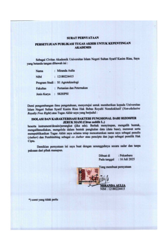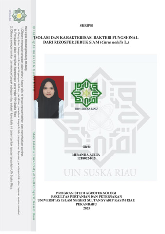ISOLASI DAN KARAKTERISASI BAKTERI FUNGSIONAL DARI RIZOSFER JERUK SIAM (Citrus nobilis L.) Miranda Aulia (12180224415) Di bawah bimbingan Syukria Ikhsan Zam dan Tiara Septirosya INTISARI Plant growth promoting rhizobacteria (PGPR) berperan dalam meningkatkan kadar mineral, fiksasi nitrogen, pelarutan fosfat, produksi hormon tanaman, serta sebagai agen biokontrol. Penelitian ini bertujuan untuk mendapatkan bakteri fungsional dari rizosfer jeruk siam. Sampel rizosfer diambil di lima titik dilahan perkebunan jeruk siam di Bangun Purba Timur Jaya secara acak. Parameter yang diamati dalam penelitian ini yaitu jumlah populasi isolat, karakteristik makroskopis, karakteristik mikroskopis, aktivitas katalase dan aktivitas biologi. Hasil penelitian menunjukkan populasi bakteri berjumlah 4,97 × 10 8 CFU/g dan didapat 5 isolat bakteri (IS1, IS2, IS3, IS4, dan IS5) yang berasal dari kelompok Gram negatif, dan memiliki aktivitas katalase. Seluruh isolat tidak memiliki kemampuan melarutkan fosfat tetapi memiliki kemampuan dalam menambat nitrogen. Aktivitas antagonis 5 isolat bakteri menghasilkan efektivitas daya hambat terhadap jamur F. oxysporum dengan rentang 14,2% sampai 57,14%. Berdasarkan uji aktivitas biologi, seluruh isolat bakteri rizosfer jeruk siam berpotensi sebagai bakteri fungsional. Diperlukan penelitian lebih lanjut terkait identifikasi untuk menentukan spesies isolat Kata Kunci : aktivitas biologi, bakteri, F. oxysporum, rizosfer