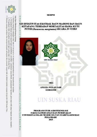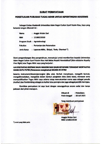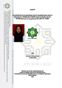 UJI EFEKTIVITAS EKSTRAK DAUN MAHONI DAN DAUN KETAPANG TERHADAP MORTALITAS HAMA KUTU PUTIH (Paracoccus marginatus) SECARA IN VITRO Anggia Wulan Sari (12180223530) Di bawah bimbingan Ahmad Taufiq Arminudin dan Aulia Rani Annisava INTISARI Pengendalian kutu putih (Paracoccus marginatus) dapat dilakukan secara kimia, namun berdampak negatif terhadap lingkungan. Alternatif ramah lingkungan yang dapat digunakan adalah pestisida nabati seperti ekstrak daun mahoni (Swietenia mahagoni L.) dan daun ketapang (Terminalia catappa L.). Penelitian ini bertujuan untuk mendapatkan konsentrasi ekstrak daun mahoni dan daun ketapang yang paling efektif terhadap mortalitas hama kutu putih (Paracoccus marginatus) secara in vitro. Penelitian ini dilakukan di Laboratorium Patologi, Entomologi, Mikrobiologi dan Ilmu Tanah (PEMTA) Fakultas Pertanian dan Peternakan Universitas Islam Negeri Sultan Syarif Kasim Riau pada bulan Februari sampai Maret 2025. Penelitian ini menggunakan Rancangan Acak Lengkap dengan 6 perlakuan yaitu P0- = aquades, P0+ = lamda sialotrin + tiametoksam 2 mL/L, dan kombinasi ekstrak daun mahoni dan daun ketapang pada konsentrasi P1 = 5%, P2 = 10%, P3 = 15%, dan P4 = 20% dengan 4 ulangan, sehingga berjumlah 24 unit percobaan. Parameter yang diamati adalah waktu awal kematian, mortalitas harian, LC50, dan mortalitas total. Hasil penelitian menunjukkan bahwa kombinasi ekstrak daun mahoni dan daun ketapang 20% merupakan perlakuan paling efektif dengan waktu awal kematian kutu putih 4,75 jam dan mortalitas total 100%, serta nilai LC50 sebesar 31,78%. Disarankan menggunakan metode aplikasi berbeda atau pada skala lapangan. Kata kunci: LC50, Mortalitas, Pestisida Nabati