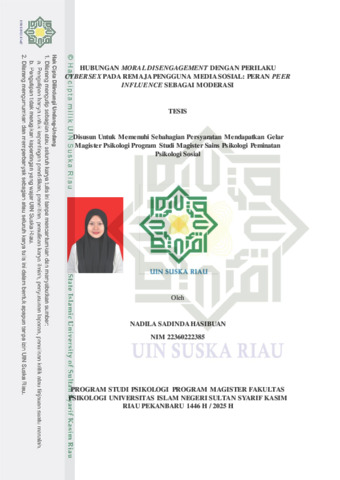 HUBUNGAN MORAL DISENGAGEMENT DENGAN PERILAKU CYBERSEX PADA REMAJA PENGGUNA MEDIA SOSIAL: PERAN PEER INFLUENCE SEBAGAI MODERASI Nadila Sadinda Hasibuan nshasibuan0909@gmail.com Magister Psikologi Universitas Islam Negeri Sultan Syarif Kasim Riau ABSTRAK Penggunaan internet dan media sosial di kalangan remaja, membuat peningkatan resiko terpaparnya perilaku cybersex pada remaja. Penelitian ini bertujuan untuk menganalisis hubungan antara moral disengagement dengan perilaku cybersex pa- da remaja pengguna media sosial, dengan mempertimbangkan peran peer influence sebagai moderator. Partisipan penelitian terdiri dari 200 orang remaja (81 laki-laki dan 119 perempuan), remaja berusia 15-22 tahun di Kota Pekanbaru yang aktif menggunakan media sosial. Metode penelitian menggunakan pendekatan kuantitatif dengan instrumen kuesioner yang diadaptasi dari Internet Sex Screening Test (ISST) untuk mengukur perilaku cybersex, Moral Disengagement Scale (MDS) untuk mengukur pelepasan moral, dan Resistance to Peer Influence Scale untuk mengukur pengaruh teman sebaya. Data dianalisis menggunakan Structural Equation Modeling (SEM) dengan bantuan Smart-PLS. Hasil penelitian menunjukkan bahwa: (1) Terdapat hubungan positif yang signifikan antara moral disengagement dengan perilaku cybersex (β = 0.178, p < 0.05), di mana remaja yang cenderung melakukan moral disengagement lebih rentan terlibat dalam perilaku cybersex; (2) Peer influence juga memiliki hubungan signifikan dengan perilaku cybersex (β = 0.154, p < 0.05), menunjukkan bahwa pengaruh teman sebaya dapat mendorong keterlibatan dalam aktivitas seksual online; (3) Peer influence berperan sebagai moderator yang memperkuat hubungan antara moral disengagement dan perilaku cybersex (β = 0.246, p < 0.05), artinya remaja dengan tingkat moral disengagement tinggi dan pengaruh teman sebaya yang kuat lebih mungkin melakukan perilaku cybersex. Implikasi penelitian ini menekankan pentingnya pendidikan moral dan pengawasan terhadap penggunaan media sosial untuk mengurangi risiko perilaku cybersex di kalangan remaja. Kata Kunci : moral disengagement, perilaku cybersex, peer influence, remaja, media sosial.