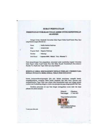 NADILA SADINDA HASIBUAN, - (2025) HUBUNGAN MORAL DISENGAGEMENT DENGAN PERILAKU CYBERSEX PADA REMAJA PENGGUNA MEDIA SOSIAL: PERAN PEER INFLUENCE SEBAGAI MODERASI. Thesis thesis, UNIVERSITAS ISLAM NEGERI SULTAN SYARIF KASIM RIAU.