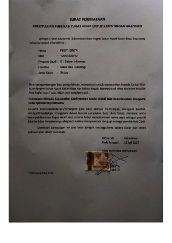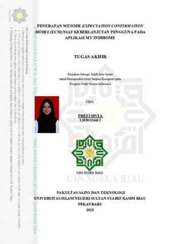 PRETI SINTA, - (2025) PENERAPAN METODE EXPECTATION CONFIRMATION MODEL (ECM) NIAT KEBERLANJUTAN PENGGUNA PADA APLIKASI MY INDIHOME. Skripsi thesis, UNIVERSITAS ISLAM NEGERI SULTAN SYARIF KASIM RIAU.