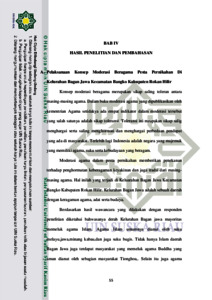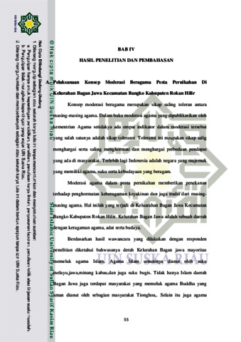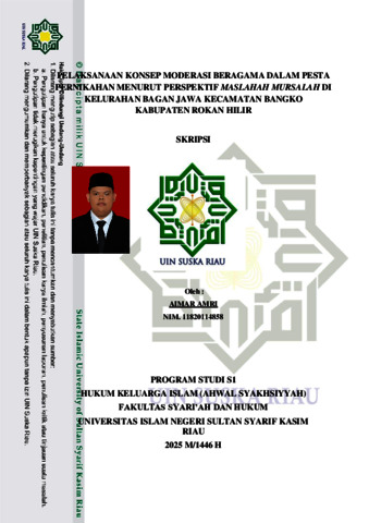 ABSTRAK Aimar Amri (2025) : Pelaksanaan Konsep Moderasi Beragama Dalam Pesta Pernikahan Menurut Perspektif Maslahah Mursalah Di Kelurahan Bagan Jawa Kecamatan Bangko Kabupaten Rokan Hilir Penelitian ini dilatar belakangi oleh keberagaman dalam pesta pernikahan yang ada di Kelurahan Bagan Jawa yang kadang memunculkan perbedaan pemahaman mengenai peran agama dalam tradisi pernikahan yang mana sebagian besar masyarakat Muslim di Bagan Jawa melihat pesta pernikahan sebagai bagian dari ibadah. Begitu juga dengan agama Katolik dan Kristen yang menjalankan proses pernikahan juga sesuai syariat dan agama masing-masing. Namun, komunitas Tionghoa cenderung melihat pernikahan sebagai tradisi budaya yang tidak terlalu terkait dengan aspek keagamaan. Penelitian ini dilakukan bertujuan: 1)Untuk mengetahui pelaksanaan konsep moderasi beragama pesta pernikahan di Kelurahan Bagan Jawa Kecamatan Bangko Kabupaten Rokan Hilir. 2) ntuk mengetahui pelaksanaan konsep moderasi beragama dalam pesta pernikahan menurut perspektif mashlahah mursalah di Kelurahan Bagan Jawa Kecamatan Bangko Kabupaten Rokan Hilir. Peneilitian ini menggunakan penelitian lapangan (field research) yang menggunakan pendekatan analisis deskriptif kualitatif. Sumber data yang di gunakan adalah data primer berupa hasil observasi dan wawancara di lapangan dengan 6 responden penelitian yang merupakan tooh agama dan masyarakat di Kelurahan Bagan Jawa Kecamatan Bangko Kabupaten Rokan Hilir. Selanjutnya adalah data sekunder berupa jurnal hukum, artikel hukum yang masih berkaitan dengan tema, penelitian yang selanjutnya data diolah dan dianalisis secara deskriptif kualitatif, sehingga menghasilkan penelitian ilmiah yang dapat di pertanggung jawabkan. Hasil penelitian ditemukan bahwa moderasi agama masyarakat Desa Bagan Jawa ditunjukkan dengan sikap toleransi antar masyarakat dalam membentuk kebersamaan dan saling tolong menolong ketika ada pesta pernikahan berlangsung meskipun terdapat perbedaan keyakinan. Konsep moderasi agama di Keluarahan Bagan Jawa sudah sesuai dengan ketentuan maslahah mursalah. Konsep moderasi agama yang diterapkan oleh masyarakat Bagan Jawa termasuk dalam kegiatan yang bertujuan untuk menjaga atau mencegah kerugian serta memberikan kemaslahatan bagi umat beragama. Kata Kunci : Moderasi Agama, Pesta Pernikahan, Maslahah Mursalah