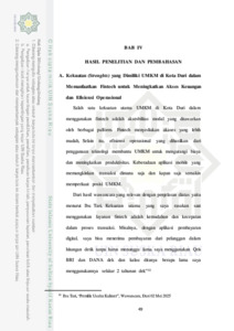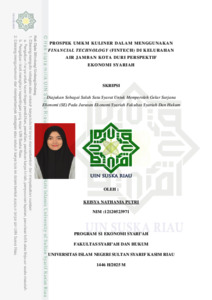 ABSTRAK Keisya Nathania Putri (2025) : Prospek Umkm Kuliner Dalam Menggunakan Financial Technology (Fintech) Di Kelurahan Air Jamban Kota Duri Perspektif Ekonomi Syariah Penelitian ini bertujuan untuk menganalisis prospek Usaha Mikro, Kecil, dan Menengah (UMKM) Kuliner di Kelurahan Air Jamban Kota Duri dalam menggunakan Financial Technology (fintech) perspektif ekonomi syariah. Seiring dengan perkembangan teknologi digital, fintech menawarkan berbagai solusi untuk meningkatkan efisiensi dan aksesibilitas layanan keuangan bagi UMKM. Namun, adopsi fintech di kalangan UMKM masih menghadapi berbagai tantangan, seperti kurangnya pemahaman tentang teknologi, keterbatasan akses infrastruktur, dan regulasi yang kompleks. Penelitian ini menggunakan metode kualitatif . penelitian ini dilakukan pada UMKM yang bergerak pada bidang kuliner yang berada di Kelurahan Air Jamban Kota Duri. Jumlah pemilik usaha yang menjadi informan ada 8 (Delapan) orang. Sumber yang digunakan adalah data primer dan data sekunder. Teknik pengumpulan data yang digunakan adalah observasi, wawancara, dan dokumentasi. Analisis data dilakukan secara kualitatif dan deskriptif. Hasil penelitian menunjukkan bahwa para UMKM ini telah menggunakan Financial Technology dalam operasional bisnis yang di jalankan, khususnya melalui penggunaan Qris dan Dana untuk pembayaran. Transaksi tunai mulai ditinggalkan, dengan banyak pelaku usaha beralih ke metode pembayaran nontunai yang dianggap praktis. Meskipun demikian, pemahaman mengenai sistem fintech dan penerapan prinsip syariah di kalangan UMKM masih terbatas. Pelaku usaha menyatakan bahwa untuk meningkatkan penggunaan fintech diperlukan edukasi yang lebih intensif dan promosi yang lebih baik di masyarakat. Kata Kunci: UMKM, Financial Technology, Ekonomi Syariah
