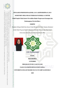 PENGARUH PROFESIONALISME, GAYA KEPEMIMPINAN, DAN KOMITMEN ORGANISASI TERHADAP KINERJA AUDITOR (Studi Empiris Pada Kantor Perwakilan Badan Pengawasan Keuangan dan Pembangunan Provinsi Riau ) OLEH : RAY HANIVA 12170320053 ABSTRAK Penelitian ini bertujuan untuk mengetahui pengaruh profesionalisme, gaya kepemimpinan, dan komitmen organisasi terhadap kinerja auditor pada Kantor Perwakilan Badan Pengawasan Keuangan dan Pembangunan Provinsi Riau. Populasi dalam penelitian ini adalah auditor yang bekerja di Kantor Perwakilan Badan Pengawasan Keuangan dan Pembangunan Provinsi Riau. Teknik pengambilan sampel menggunakan sampel jenuh sehingga total sampel berjumlah 35 auditor. Analisis data menggunakan uji asumsi klasik dan pengujian hipotesis menggunakan alat bantu SPSS20. Hasil penelitian menunjukkan bahwa profesionalisme dan komitmen organisasi berpengaruh signifikan terhadap kinerja auditor. Sedangkan gaya kepemimpinan tidak berpengaruh terhadap kinerja auditor. Hasil uji R-Square menunjukkan bahwa variabel independen yang digunakan dalam penelitian ini dapat menjelaskan variabel dependen sebesar 67,3% sedangkan sisanya 32,7% dipengaruhi oleh variabel lainnya yang tidak diteliti dalam penelitian ini seperti variabel struktur audit, motivasi kerja, kecerdasan emosional, locus of control, dan lain-lain. Kata Kunci : Kinerja Auditor, Profesionalisme, Gaya Kepemimpinan, Komitmen Organisasi