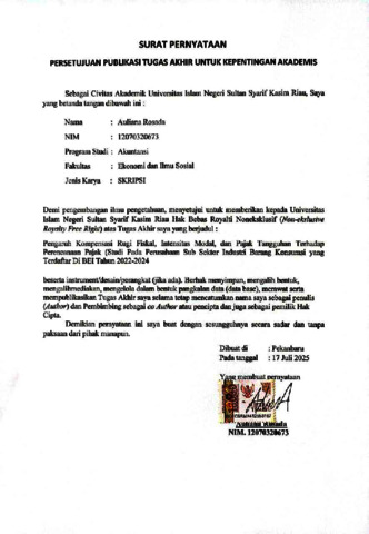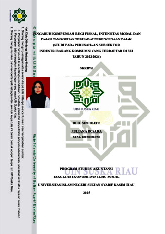 AULIANA ROSADA, - (2025) PENGARUH KOMPENSASI RUGI FISKAL, INTENSITAS MODAL DAN PAJAK TANGGUHAN TERHADAP PERENCANAAN PAJAK (STUDI PADA PERUSAHAAN SUB SEKTOR INDUSTRI BARANG KOMSUMSI YANG TERDAFTAR DI BEI TAHUN 2022-2024). Skripsi thesis, UNIVERSITAS ISLAM NEGERI SULTAN SYARIF KASIM RIAU.