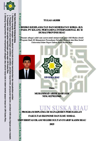 ABSTRAK RISIKO KESELAMATAN DAN KESEHATAN KERJA PADA PT KILANG PERTAMINA INTERNASIONAL RU II DUMAI PROVINSI RIAU Oleh: MUHAMMAD ARIEF HARYADI NIM : 02270215469 Seiring meningkatnya kesadaran akan keselamatan dan kesehatan terhadap pekerja, mendorong banyak perusahaan untuk meningkatkan upaya penerapan dan perbaikan program K3(Keselamatan dan Kesehatan kerja). Proses produksi di PT Kilang Pertamina Internasional RU II ini memiliki potensi risiko yang cukup tinggi seperti terpapar bahan kimia berbahaya, bekerja di ketinggian, dan lain sebagainya Penulisan ini dilakukan dengan maksud dan tujuan untuk mengetahui jenis resiko K3, hambatan dalam penerapannya, serta upaya yang dilakukan pada PT Kilang Pertamina Internasional RU II Dumai . Metode penulisan yang diterapkan yaitu metode Deskriptif. Pengumpulan data melalui observasi, wawancara dan dokumentasi. Hasil penulisan ini memperlihatkan bahwa meskipun system manajemen K3 telah di terapkan, masih ditemukan hambatan seperti kurangnya kesiapsiagaan dan pemeliharaan peralatan.perusahaan mengatasinya melalui SOP,pelatihan keselamatan,serta analisis risiko kerja menggunakan metode HIRADC dan JSA. Kata kunci: K3 (Keselamatan dan kesehatan kerja), Risiko, Risk Management, Job Safety Analysis, HAZARD