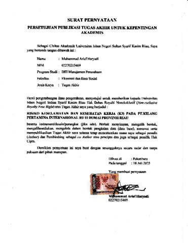 MUHAMMAD ARIEF HARYADI, - (2025) RISIKO KESELAMATAN DAN KESEHATAN KERJA (K3) PADA PT KILANG PERTAMINA INTERNASIONAL RU II DUMAI PROVINSI RIAU. Skripsi thesis, UNIVERSITAS ISLAM NEGERI SULTAN SYARIF KASIM RIAU.