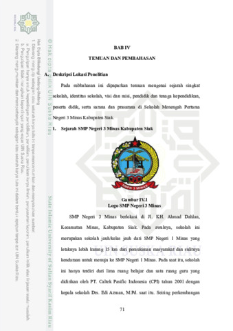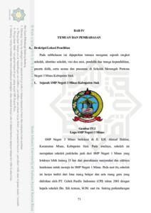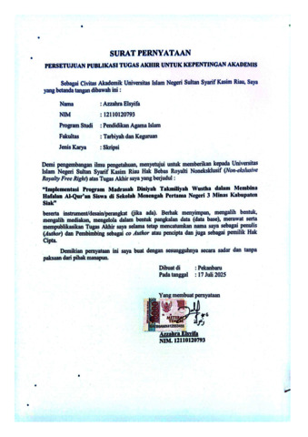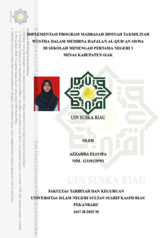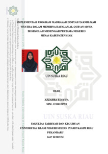 ABSTRACT Azzahra Elsyifa, (2025): The Implementation of Madrasah Diniyah Takmiliyah Wustha Program in Strengthening Student Quranic Memorization at State Junior High School 3 Minas, Siak Regency This research aimed at describing the implementation of Madrasah Diniyah Takmiliyah Wustha program in strengthening student Quranic memorization at State Junior High School 3 Minas, Siak Regency and the supporting and obstructing factors. Qualitative descriptive approach was used in this research. The primary informants were two Quranic memorization teachers and four students, while the headmaster served as a supporting informant. Observation, interview, and documentation were the techniques of collecting data. The data were analyzed by using data reduction, data display, and drawing conclusion. The research findings showed that the implementation of Madrasah Diniyah Takmiliyah Wustha program in strengthening student Quranic memorization comprised three main stages: first, the planning phase included setting goals, defining implementation standards, allocating budgets and resources, scheduling, setting memorization targets, and selecting participants. Second, the implementation phase generally adhered to the standard operating procedures established by the school. Talaqqi and muraja'ah methods were used in the implementation process, with a system of memorization submissions tracked through memorization cards. Third, evaluation was conducted periodically in the form of oral examinations. The supporting factors were government support, teacher support, support for tadarus Al-Quran and muhadharah programs, safe physical school environment free from external distractions, and the graduation activities of tahfiz Al-Quran at the end of the period. The obstructing factors included the lack of student internal motivation, lack of parental support at home, the characteristics of schools that were not based on religion, the peer environment at school, limited learning time, and the divided focus of students. Keywords: Madrasah Diniyah Takmiliyah Wustha, Quranic Memorization