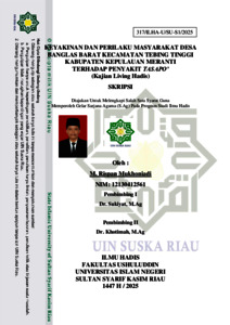 Skripsi ini berjudul “Keyakinan dan Perilaku Masyarakat Desa Banglas Barat Kecamatan Tebing Tinggi Kabupaten Kepulauan Meranti terhadap Penyakit Tasapo‟ (Kajian Living Hadis)”. Di latarbelakangi oleh fenomena adanya kepercayaan masyrakat tentang penyakit Tasapo‘. Penyakit Tasapo‘ merupakan bentuk gangguan non-medis yang diyakini oleh masyarakat setempat sebagai akibat dari pelanggaran terhadap adat atau mengganggu makhluk halus secara tidak sengaja. Keyakinan ini telah mengakar dan menjadi bagian dari kearifan lokal masyarakat Melayu di Desa Banglas Barat. Permasalahan dalam penelitian ini adalah penulis ingin melihat keyakinan masyarakat terhadap penyakit Tasapo‘ dan hubungan perilaku dan keyakinan masyarakat terhadap penyakit tersebut. Penelitian ini bertujuan untuk mengetahui keyakinan masyarakat terhadap penyakit Tasapo‘ serta hubungan antara perilaku masyarakat berbasis hadis dalam pengobatan penyakit Tasapo‘. Metode yang digunakan di penelitian ini adalah metode deskriptif kualitatif dengan menggunakan instrumen observasi dan wawancara. Adapun hasil dari penelitian ini menunjukkan bahwa masyarakat meyakini penyakit Tasapo‘ disebabkan oleh gangguan makhluk halus karena tindakan atau perilaku manusia yang tidak sopan di tempat tertentu. Masyarakat lebih memilih pengobatan tradisional melalui bantuan dukun dengan menggunakan bahan alami dan bacaan-bacaan yang terkadang berisi ayat-ayat Al- Qur‘an. Perspektif living hadis terhadap praktik ini menunjukkan bahwa meskipun pengobatan dilakukan dengan cara tradisional, sebagian masyarakat mulai mengaitkannya dengan ajaran Islam, khususnya hadis tentang perlindungan diri dari gangguan jin, sehingga dapat dipahami bahwa pengobatan ini boleh dilakukan selama tidak mengandung unsur syirik dan tetap meyakini bahwa kesembuhan hanya datang dari Allah SWT. Kata Kunci: Keyakinan, Perilaku, Tasapo’, Masyarakat Melayu, Living Hadis