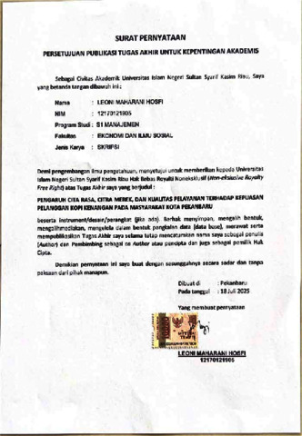 LEONI MAHARANI HOSFI, - (2025) PENGARUH CITA RASA, CITRA MEREK DAN KUALITAS PELAYANAN TERHADAP KEPUASAN PELANGGAN KOPI KENANGAN PADA MASYARAKAT KOTA PEKANBARU. Skripsi thesis, UNIVERSITAS ISLAM NEGERI SULTAN SYARIF KASIM RIAU.
