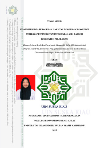 ABSTRAK KONTRIBUSI BEA PEROLEHAN HAK ATAS TANAH DAN BANGUNAN TERHADAP PENINGKATAN PENDAPATAN ASLI DAERAH KABUPATEN PELALAWAN OLEH DIAN KARISMA NIM: 02270620563 Penelitian ini dilaksanakan pada awal April 2025 hingga akhir mei 2025. Penelitian ini dilakukan di Kantor Badan Pendapatan Daerah Kabupaten Pelalawan, yang mana bertujuan: (1) Untuk mengetahui bagaimana kontribusi Bea Perolehan Hak Atas Tanah dan Bangunan pada Pendapatan Asli Daerah Kabupaten Pelalawan, (2) Untuk mengetahui upaya apa saja yang dilakukan Bapenda untuk meningkatkan Pendapatan Bea Perolehan Hak Atas Tanah dan Bangunan. Penelitian ini menggunakan pendekatan kualitatif dengan metode deskriptif. Teknik dalam pengumpulan data dengan cara observasi dan wawancara kepada pihak terkait. Kontribusi Bea Perolehan Hak Atas Tanah dan Bangunan Terhadap Pendapatan Asli Daerah Kabupaten Pelalawan masih tergolong rendah, hal tersebut dipengaruhi oleh beberapa kendala yang ditemui oleh badan pendapatan daerah kab pelalawan salah satunya adalah susahnya mencari objek pajak dan subjek pajak karena adanya perbedaan antara data objek dengan hasil survey petugas ke lapangan sehingga tidak ditemukan atau dijumpai objek pajaknya. Kata Kunci : Kontribusi, Bea Perolehan Hak Atas Tanah dan Bangunan, Pendapatan Asli Daerah
