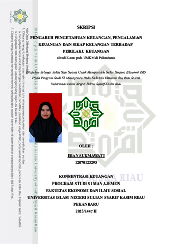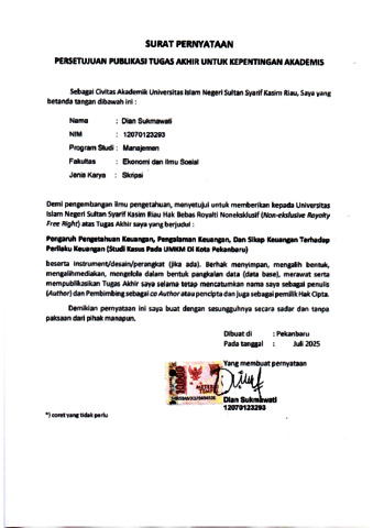 PENGARUH PENGETAHUAN KEUANGAN, PENGALAMAN KEUANGAN DAN SIKAP KEUANGAN TERHADAP PERILAKU KEUANGAN ( Studi Kasus Pada Umkm Kota Pekanbaru) OLEH: DIAN SUKMAWATI 12070123293 ABSTRAK Penelitian ini bertujuan untuk menganalisis pengaruh pengetahuan keuangan, pengalaman keuangan, dan sikap keuangan terhadap perilaku keuangan pelaku UMKM sektor makanan dan minuman di Kota Pekanbaru. Perilaku keuangan yang baik sangat penting bagi pelaku UMKM untuk menjaga kelangsungan usaha dan mencapai kesejahteraan finansial. Penelitian ini menggunakan pendekatan kuantitatif dengan metode survei. Data primer diperoleh melalui penyebaran kuesioner secara langsung kepada pelaku UMKM serta secara online melalui aplikasi WhatsApp kepada responden yang tidak dapat dijangkau secara tatap muka. Jumlah sampel dalam penelitian ini adalah 239 pelaku UMKM yang dipilih menggunakan teknik purposive sampling. Responden yang berpartisipasi adalah pemilik UMKM di bidang makanan dan minuman yang berdomisili di kota Pekanbaru., serta data dianalisis menggunakan perangkat lunak SPSS dan SmartPLS versi 4. Hasil penelitian menunjukkan bahwa pengetahuan keuangan, pengalaman keuangan, dan sikap keuangan berpengaruh positif dan signifikan terhadap perilaku keuangan. Temuan ini menegaskan pentingnya literasi dan sikap keuangan dalam mendukung pengambilan keputusan keuangan yang bijak di kalangan UMKM. Kata Kunci: Pengetahuan Keuangan, Pengalaman Keuangan, Sikap Keuangan, Perilaku Keuangan, UMKM
