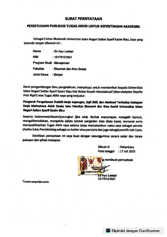 Surat Pernyataan Persetujuan Publikasi - SRI AYU LESTARI MANAJEMEN.pdf - Published Version Download (561kB) | Preview |
